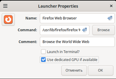 Section titled “Cinnamon”Similar to Plasma, Cinnamon also allows you to select the GPU for specific applications. Right-click the application’s desktop entry, go to Properties, and enable the relevant option.