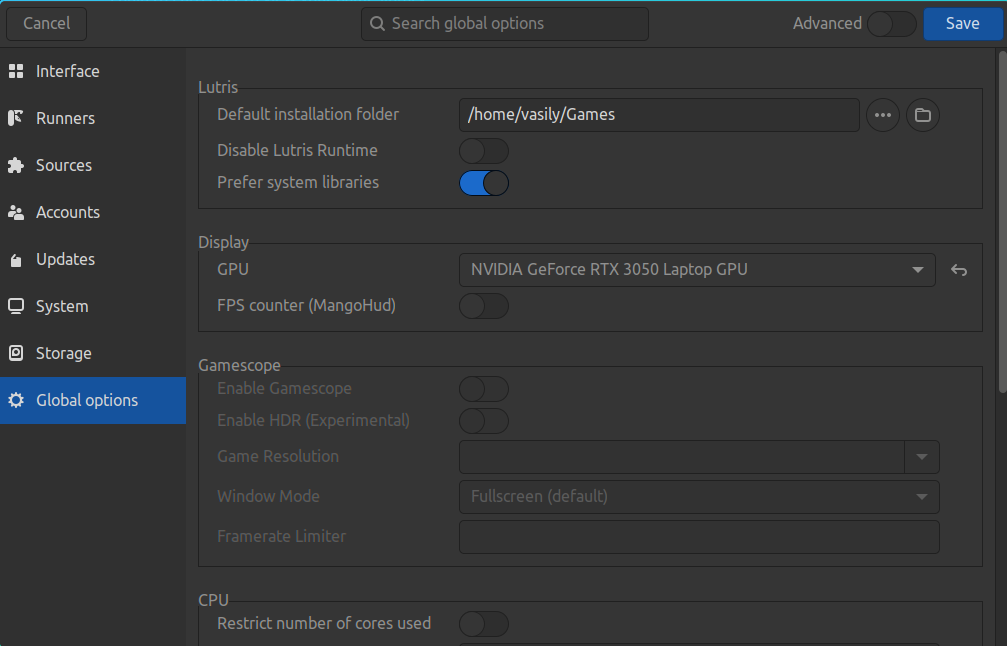 Section titled “Lutris”To configure games to run with discrete graphics in Lutris you need to go to settings (three strips in the bottom right corner of the window and “Preferences” button). Next, go to “Global Options” -> “Display”. Here, you can select the GPU the game will run on.