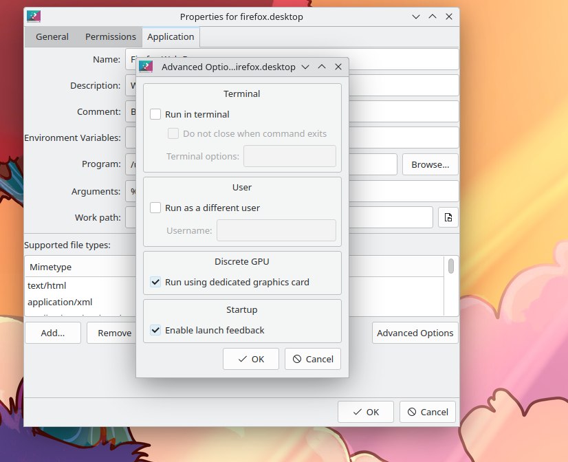 sudo pacman -S switcheroo-controlsudo systemctl enable --now switcheroo-controlAfter having executed both commands, right click on the desktop entry you want on your desktop or in the application menu then go to “Properties” -> “Application” -> “Advanced Options”.