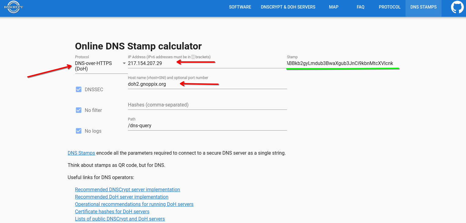 Section titled “Manual Stamp calculation”Goto -> https://dnscrypt.info/stamps/